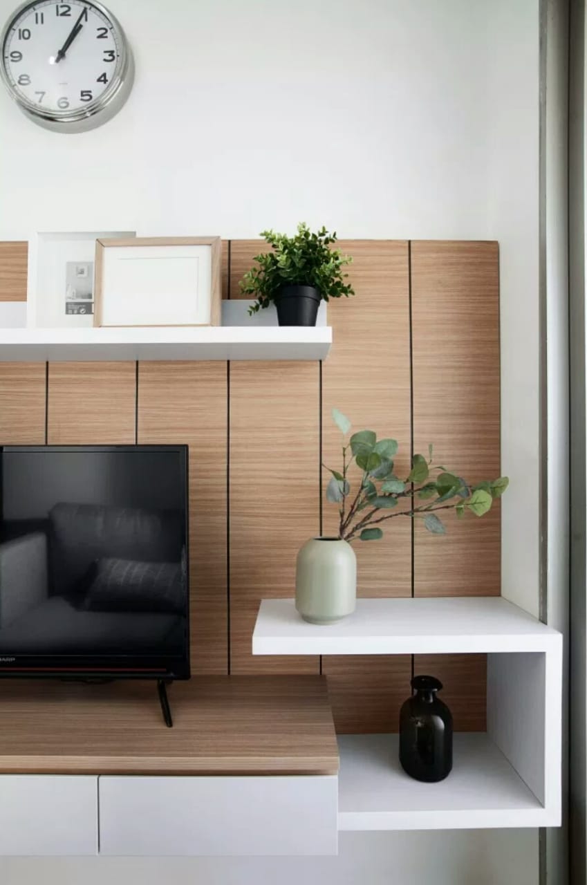 Model rak display yang menggantung seperti ini membuat ruang keluarga di apartemen terlihat lebih lapang dan luas. Selain itu, menggunakan furnitur tanpa kaki membuat bersih-bersih jadi lebih mudah, karena nggak ada kotoran atau debu yang menyangkut di bawahnya.