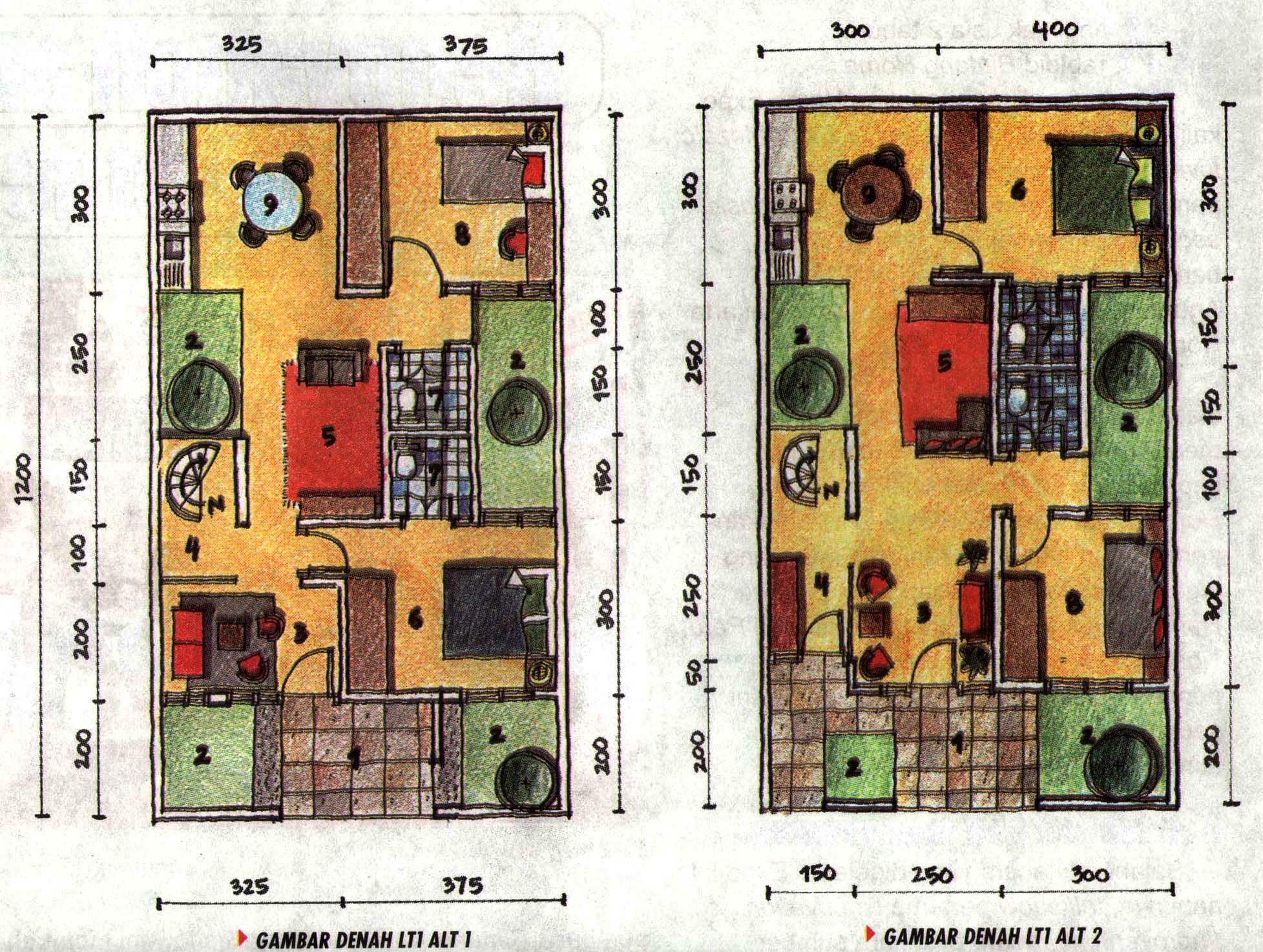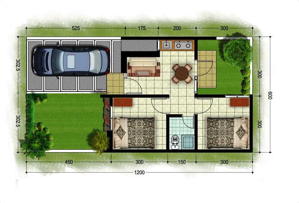 Pada desain denah satu lantai untuk ukuran tanah seluas 60 meter persegi, Anda bisa mendapatkan 6 fungsi ruang. 6 ruang tersebut terdiri dari ruang tamu, 2 kamar tidur dan kamar mandi. Terdapat pula dapur dan ruang makan yang dapat dibuat menyatu. Desain denah ini dianggap paling ideal untuk bangunan berukuran 6×6 meter persegi.