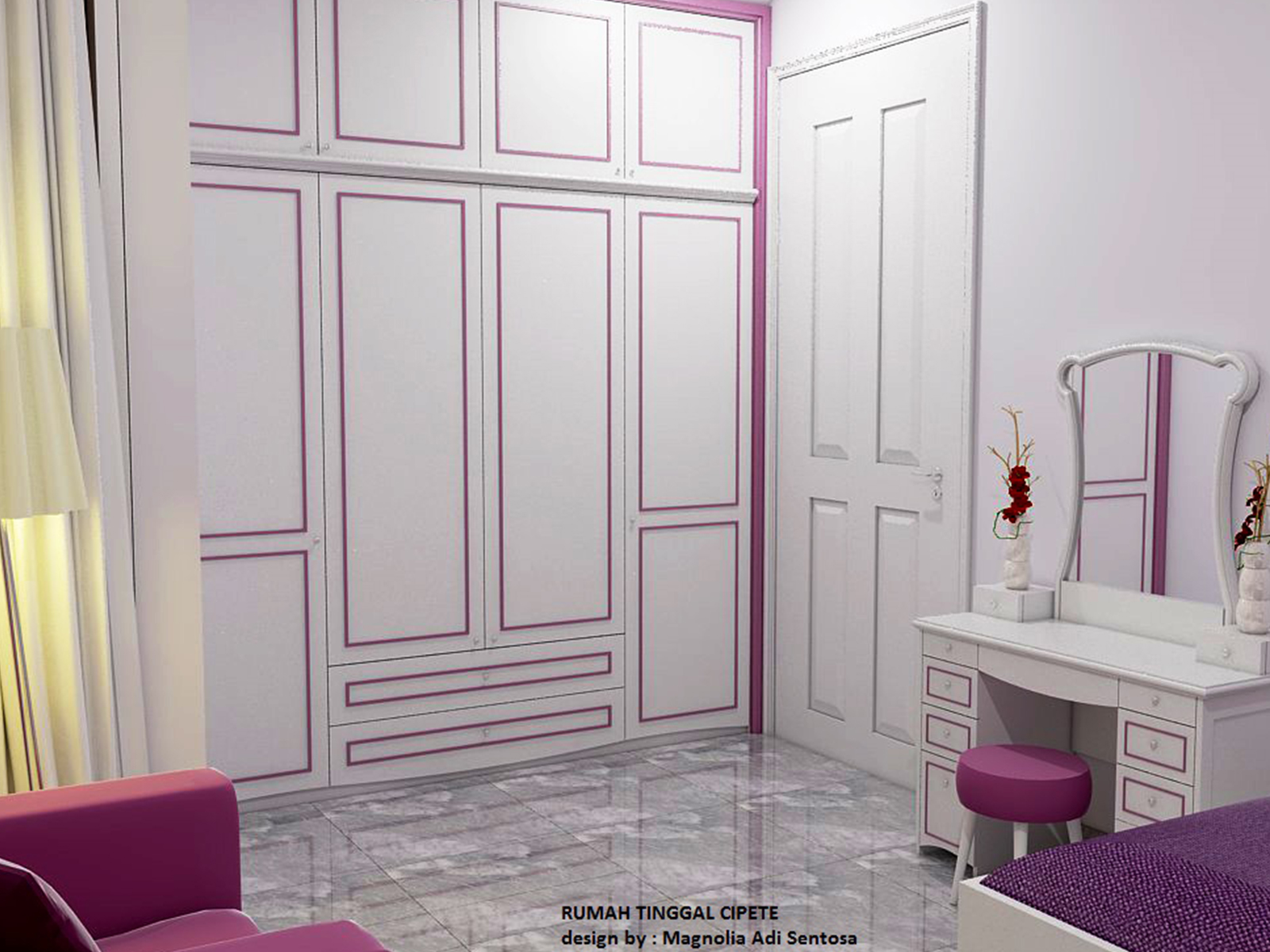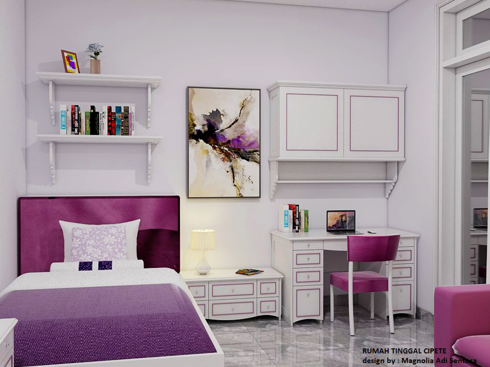 The Girl's Bedroom is designed with a Classic Modern concept. The color choice for the interior of the room is purple and white, which are the favorite colors of the daughter of the house owner.