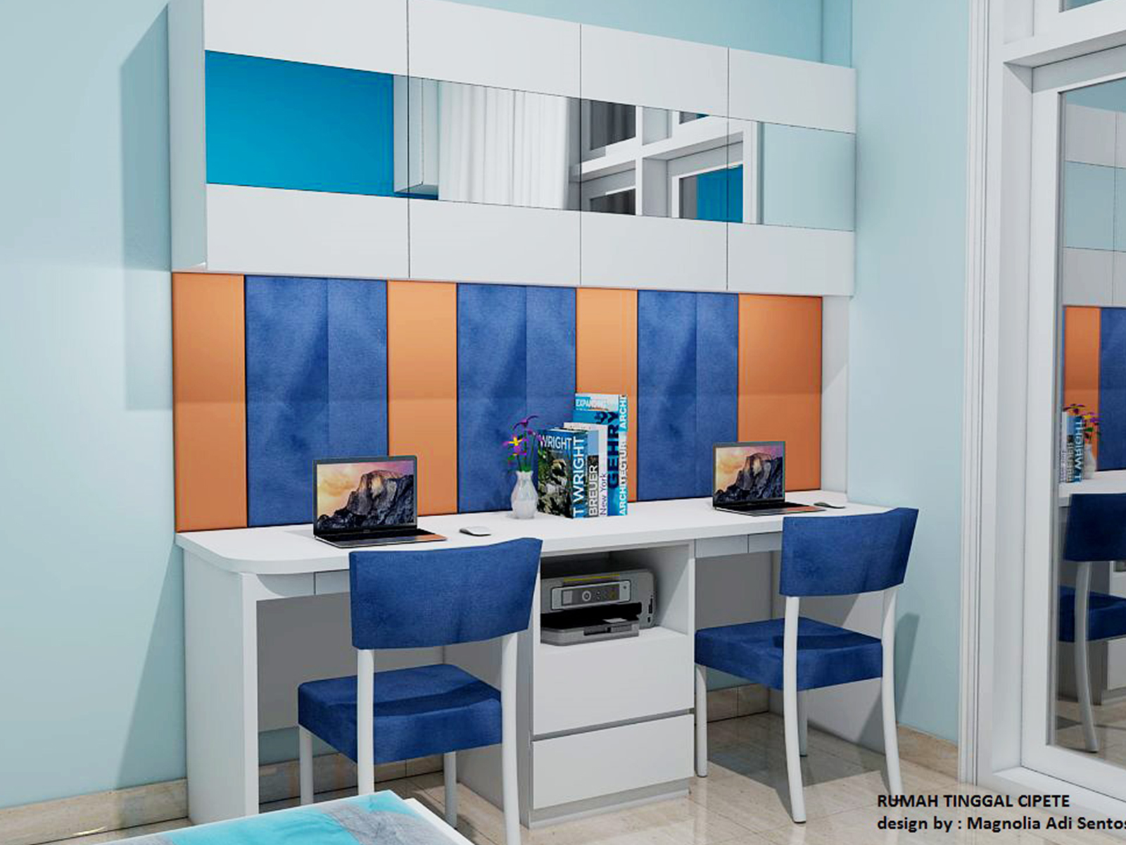 Boy's Bedroom for 2 boys home owners, taking the concept of Modern Minimalism. The choice of blue and orange gives an energetic and fresh impression.