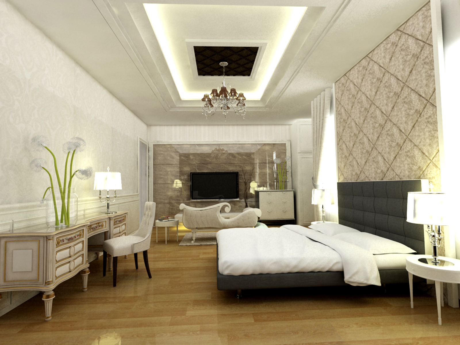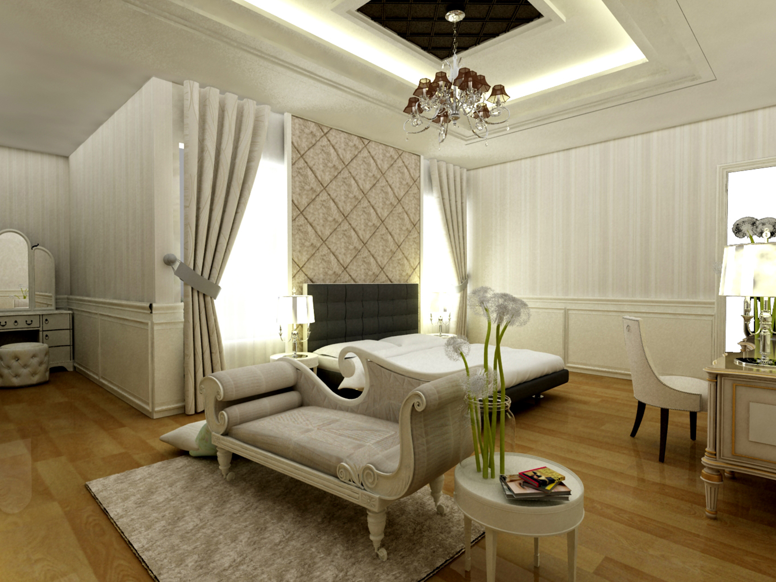 The classic design is the choice of homeowners for the master bedroom design. The impression of luxury and comfort like in a 5 star hotel is applied in this residence. The combination of cream marble and light brown wooden parquet floors to give the impression of a wider room, with a dominant white duco finish on the furniture.