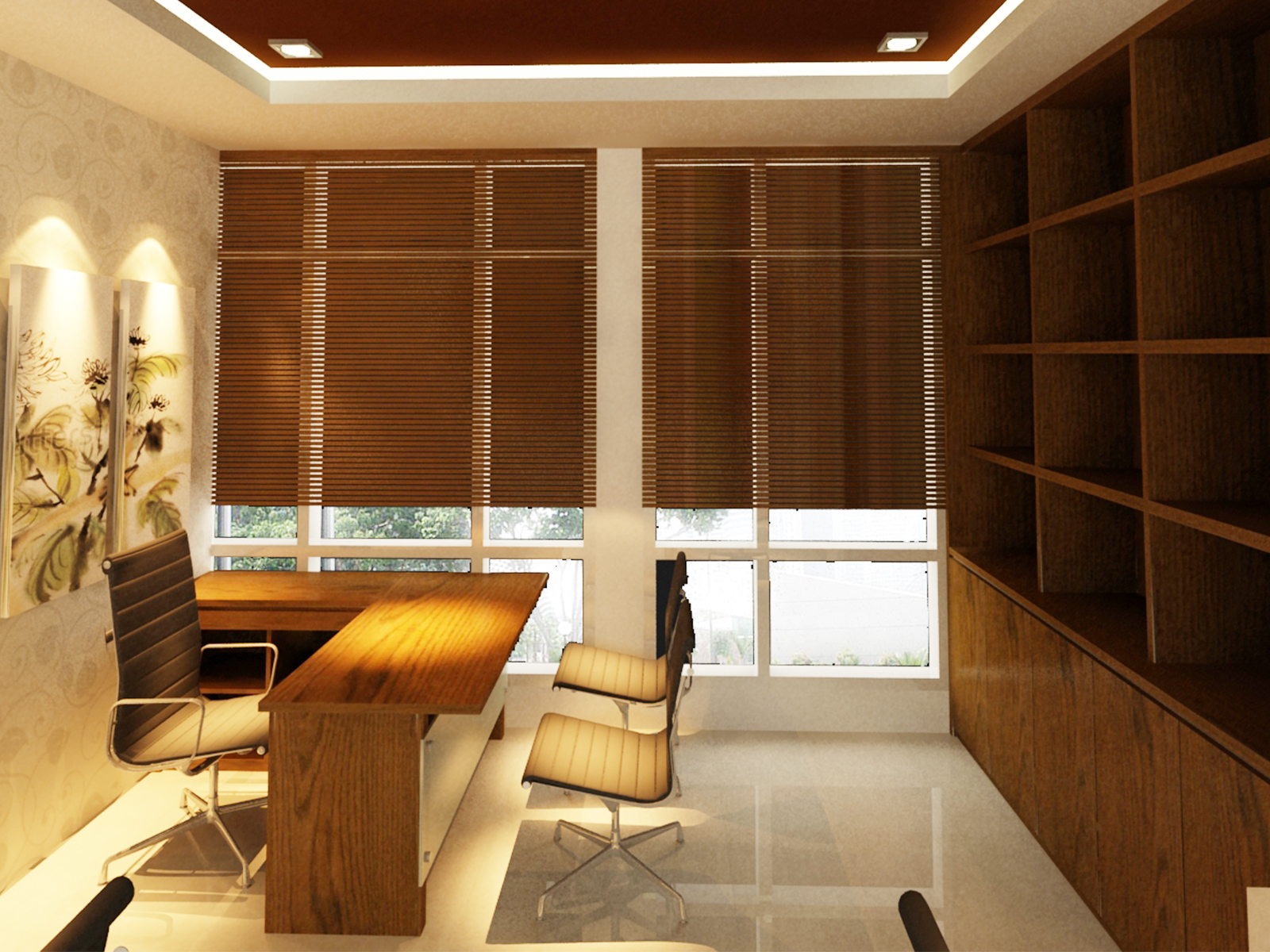 The concept used in the interior of this office is an appropriate minimalist design. Cream & brown colors are the main choices in material selection colours. The room between leaders and employees is separated using partitions & glass doors, so that privacy is maintained.